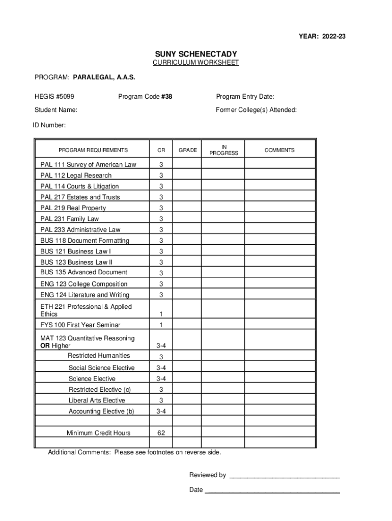 YEAR: 202223SUNY SCHENECTADY CURRICULUM WORKSHEET PROGRAM: PARALEGAL, A.A.S. AEGIS #5099Program Code #38Program Entry Date: Former College(s) Attended:Student Name: ID Number:PROGRAM REQUIREMENTSCRPAL