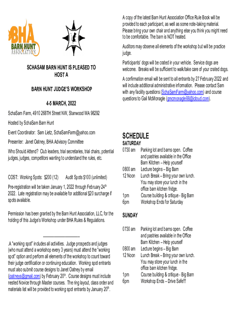 A copy of the latest Barn Hunt Association Office Rule Book will be provided to each participant, as well as some note-taking material. Please bring your own chair and anything else you think you
