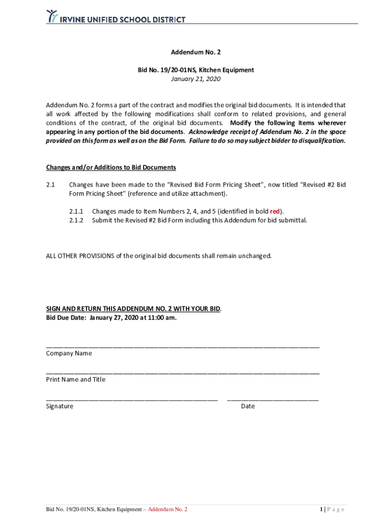 Get the free Addendum No. 2 - Bid No. 19/20-01NS, Kitchen Equipment