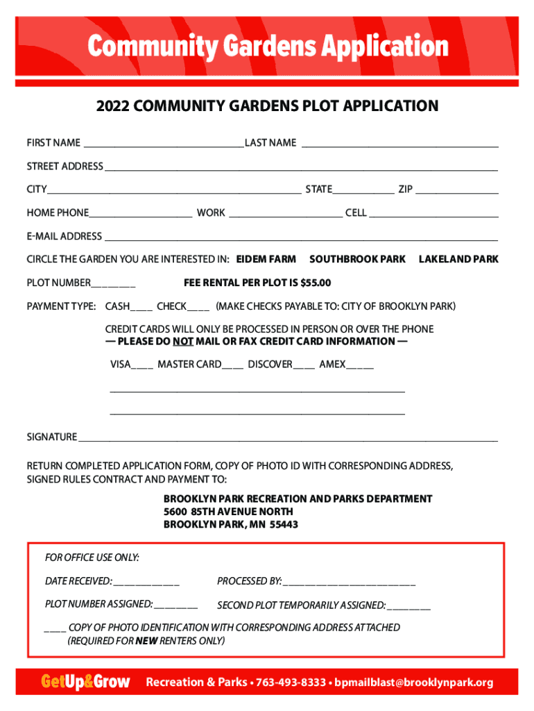 Fill out all required information on the form, including your name, contact information, and the size of garden plot you are requesting.