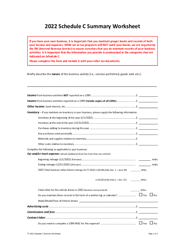 2022 Schedule C Summary Worksheet If you have your own business, it is important that you maintain proper books and records of both your income and expenses. While we as tax preparers will NOT audit