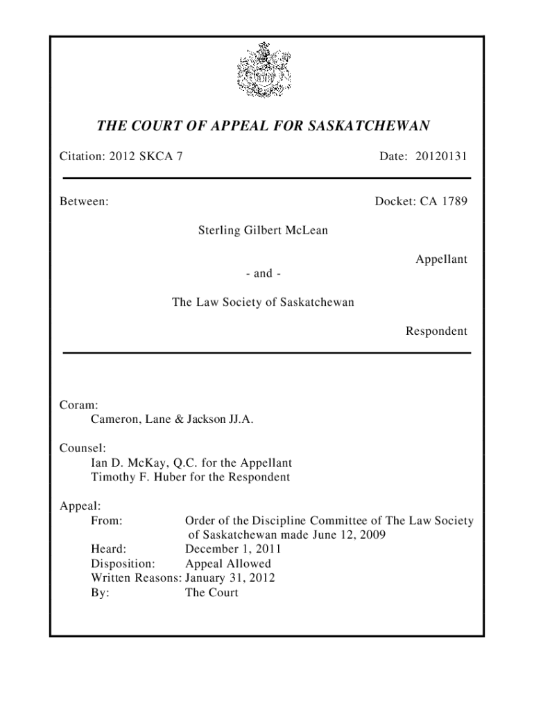 THE COURT OF APPEAL FOR SASKATCHEWAN Citation: 2012 SKA 7Date: 20120131Between:Docket: CA 1789 Sterling Gilbert McLean Appellant and The Law Society of Saskatchewan RespondentCoram: Cameron, Lane