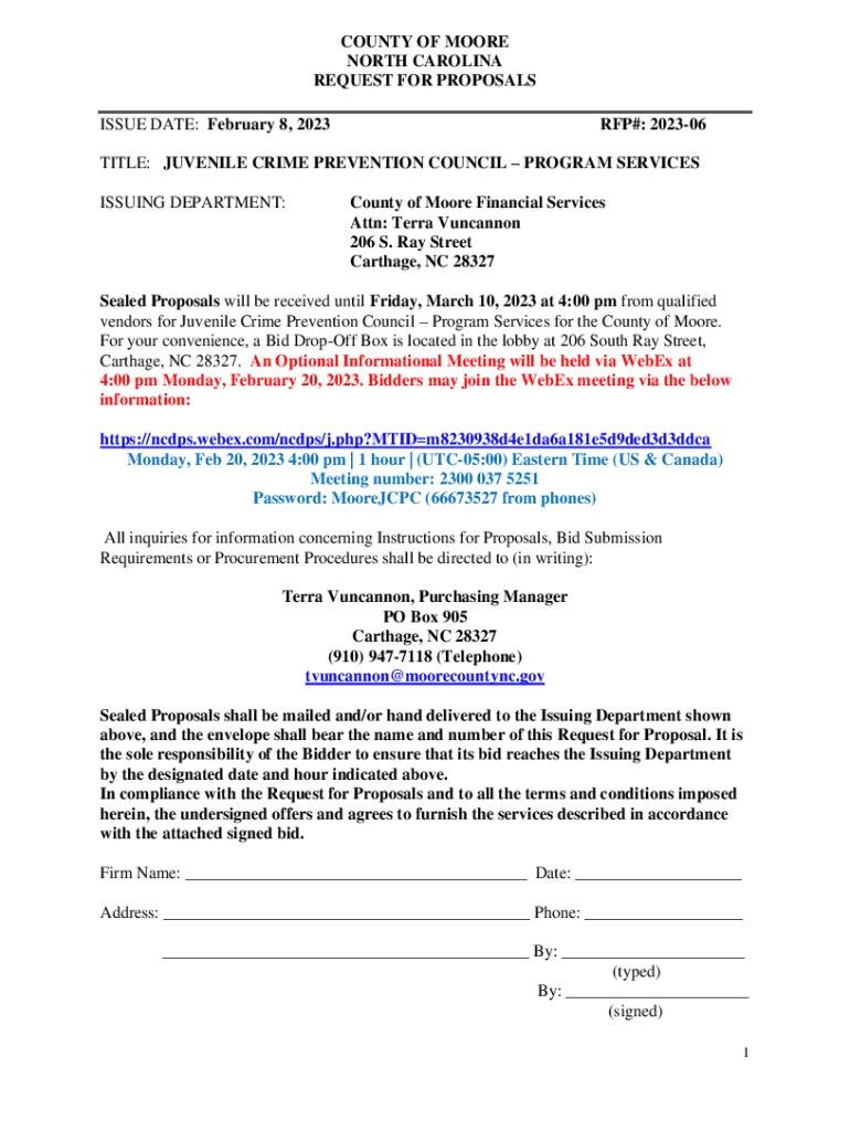 COUNTY OF MOORE NORTH CAROLINA REQUEST FOR PROPOSALS ISSUE DATE: February 8, 2023RFP#: 202306TITLE: JUVENILE CRIME PREVENTION COUNCIL PROGRAM SERVICES ISSUING DEPARTMENT:County of Moore Financial