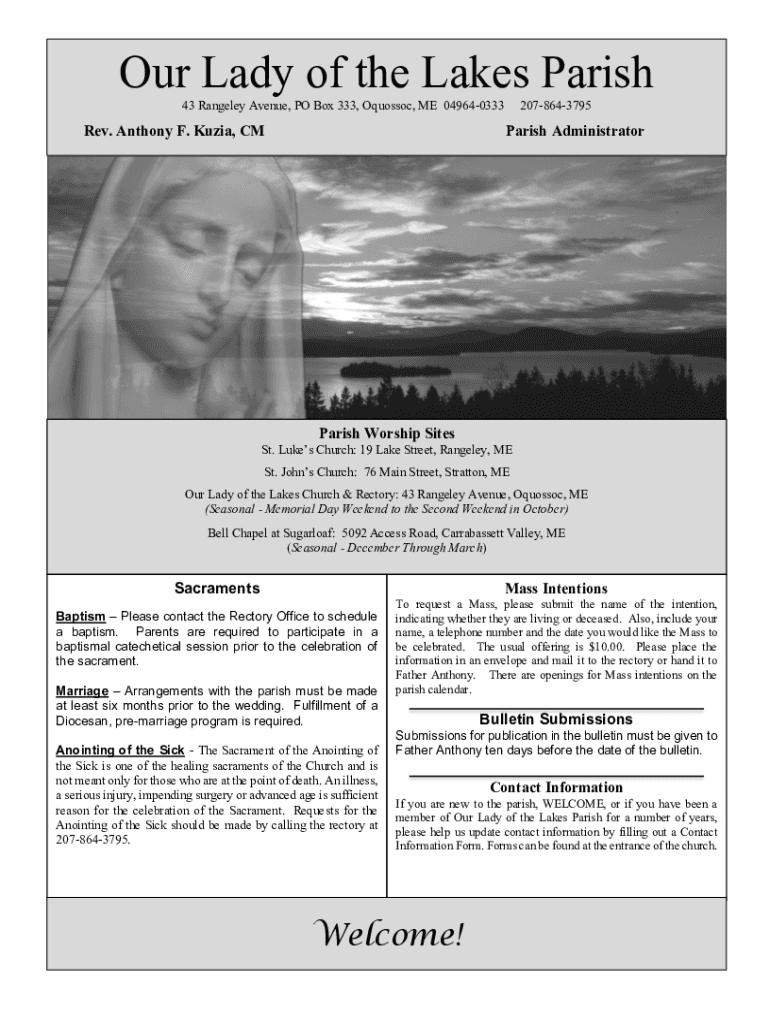 Our Lady of the Lakes Parish 43 Angeles Avenue, PO Box 333, Oquossoc, ME 049640333Rev. Anthony F. Julia, CM2078643795Parish AdministratorParish Worship Sites St. Luke's Church: 19 Lake Street, Angeles,