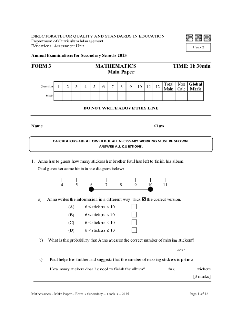 DIRECTORATE FOR QUALITY AND STANDARDS IN EDUCATION Department of Curriculum Management Educational Assessment UnitTrack 3Annual Examinations for Secondary Schools 2015FORM 3QuestionMATHEMATICS Main