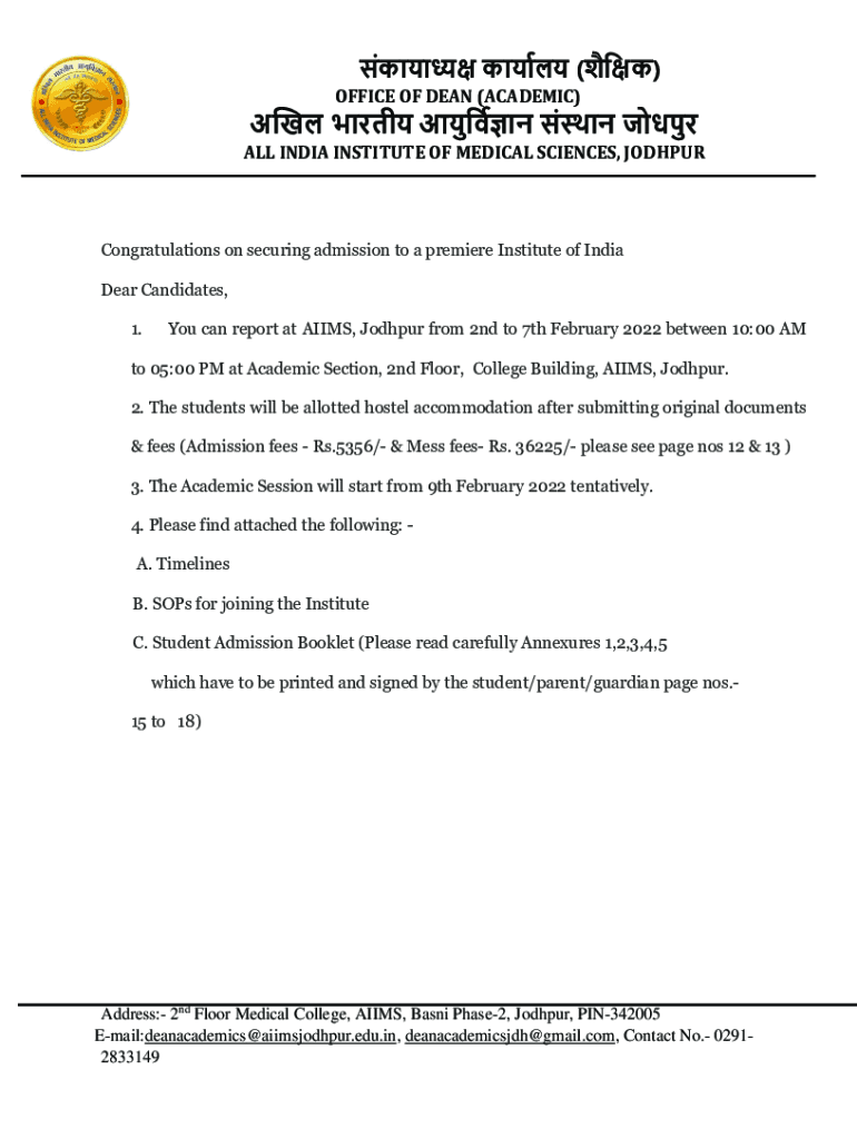 () OFFICE OF DEAN (ACADEMIC) ALL INDIA INSTITUTE OF MEDICAL SCIENCES, JODHPURCongratulations on securing admission to a premiere Institute of India Dear Candidates, 1. You can report at AIMS, Jodhpur