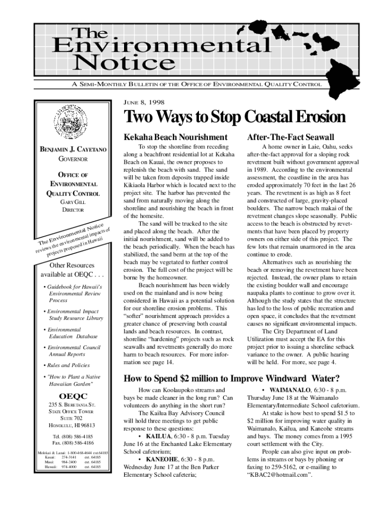 8 7 12TheEnvironmentalNotice345A SEMI MONTHLY BULLETIN OF THE OFFICE OF ENVIRONMENTAL QUALITY CONTROL JUNE 8, 19986Two Ways to Stop Coastal Erosion BENJAMIN J. CAETANO GOVERNOR OFFICE OF ENVIRONMENTAL
