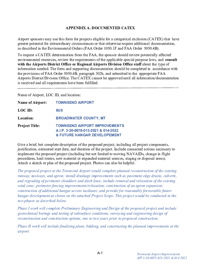 APPENDIX A. DOCUMENTED CATER Airport sponsors may use this form for projects eligible for a categorical exclusion (CATER) that have greater potential for extraordinary circumstances or that otherwise