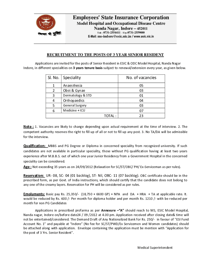 Employees\' State Insurance Corporation Model Hospital and Occupational Disease CentreNanda Nagar, Indore 452011 Tell 07312554411 / Fax07312559080EMail: msindore@esic.nic.in / www.esic.nic.inRECRUITMENT