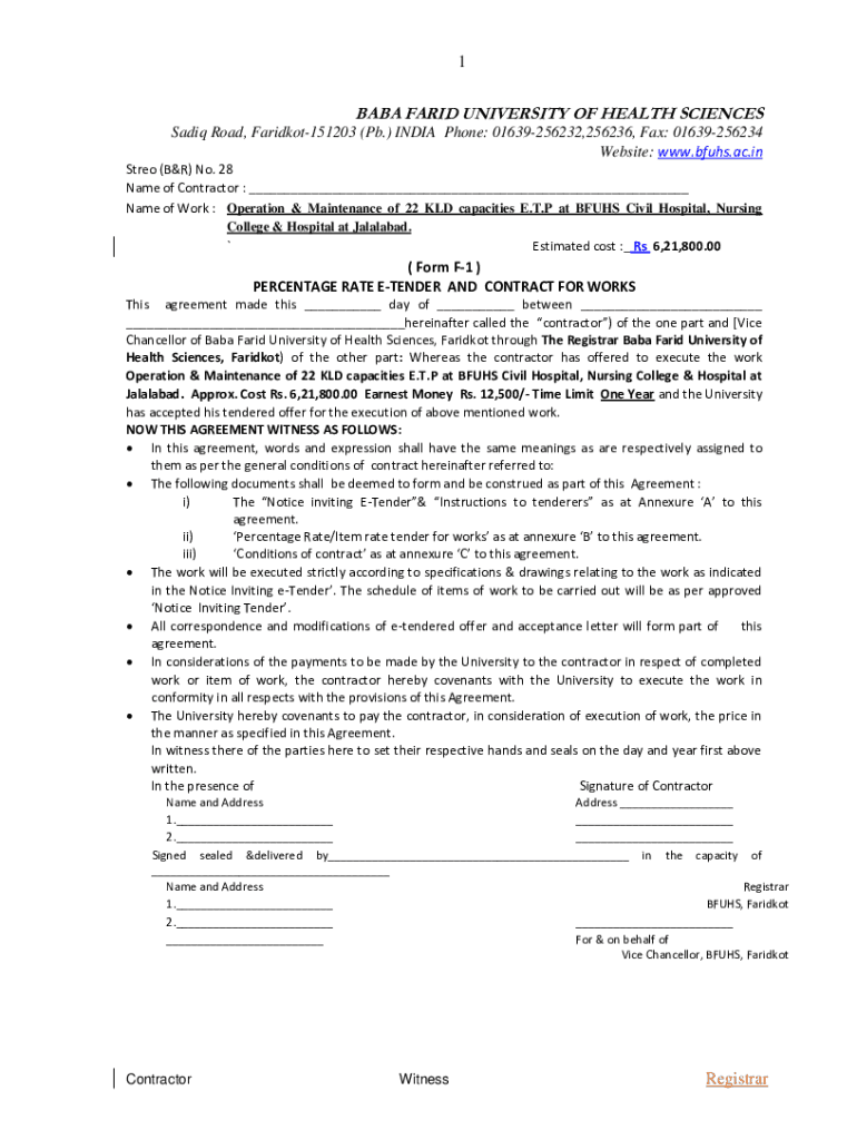 1BABA FARID UNIVERSITY OF HEALTH SCIENCES Sadiq Road, Faridkot151203 (Pb.) INDIA Phone: 01639256232,256236, Fax: 01639256234 Website: www.bfuhs.ac.in Stereo (B&R) No. 28 Name of Contractor : ___ Name