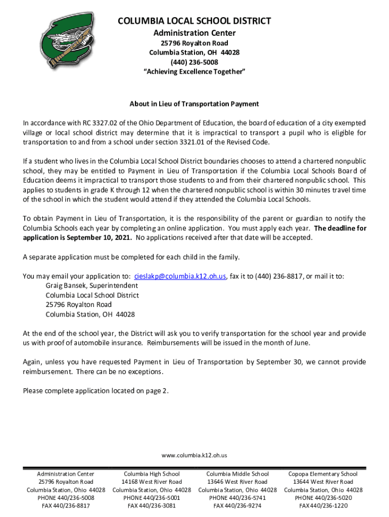 COLUMBIA LOCAL SCHOOL DISTRICT Administration Center 25796 Royal ton Road Columbia Station, OH 44028 (440) 2365008 Achieving Excellence TogetherAbout in Lieu of Transportation Payment In accordance