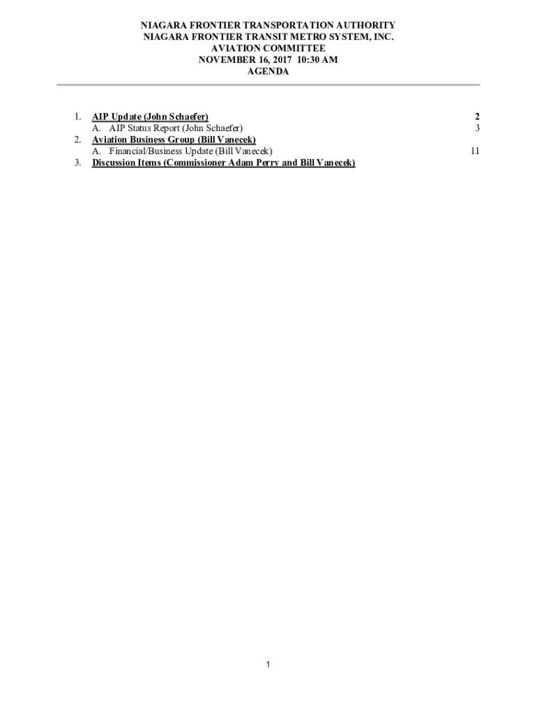 NIAGARA FRONTIER TRANSPORTATION AUTHORITY NIAGARA FRONTIER TRANSIT METRO SYSTEM, INC. AVIATION COMMITTEE NOVEMBER 16, 2017 10:30 AM AGENDA1. 2. 3.AIP Update (John Schaefer) A. AIP Status Report (John
