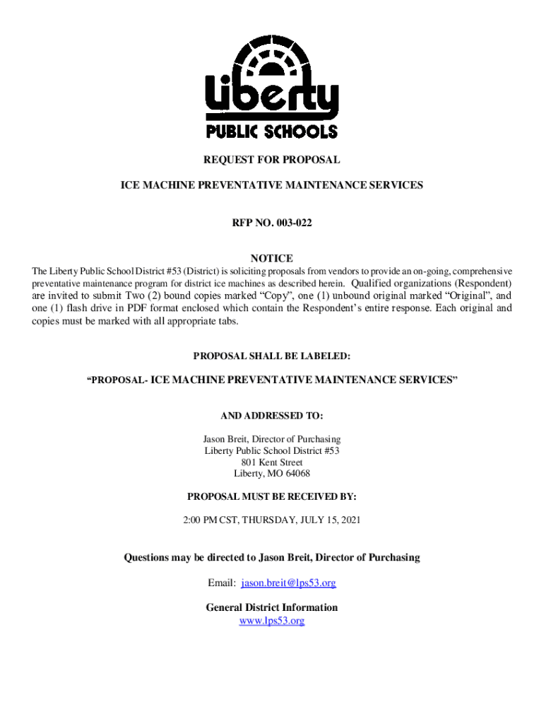 REQUEST FOR PROPOSAL ICE MACHINE PREVENTATIVE MAINTENANCE SERVICES RFP NO. 003022 NOTICE The Liberty Public School District #53 (District) is soliciting proposals from vendors to provide an ongoing,