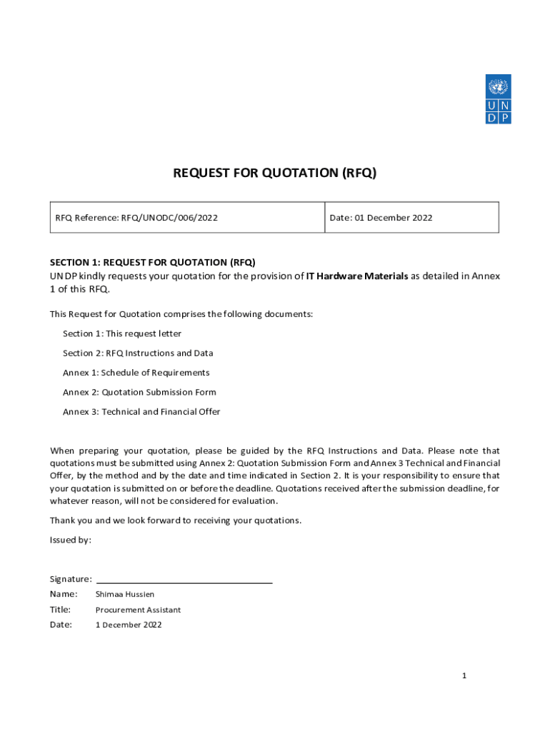 REQUEST FOR QUOTATION (RFQ) RFQ Reference: RFQ/UNODC/006/2022Date: 01 December 2022SECTION 1: REQUEST FOR QUOTATION (RFQ) UNDP kindly requests your quotation for the provision of IT Hardware Materials