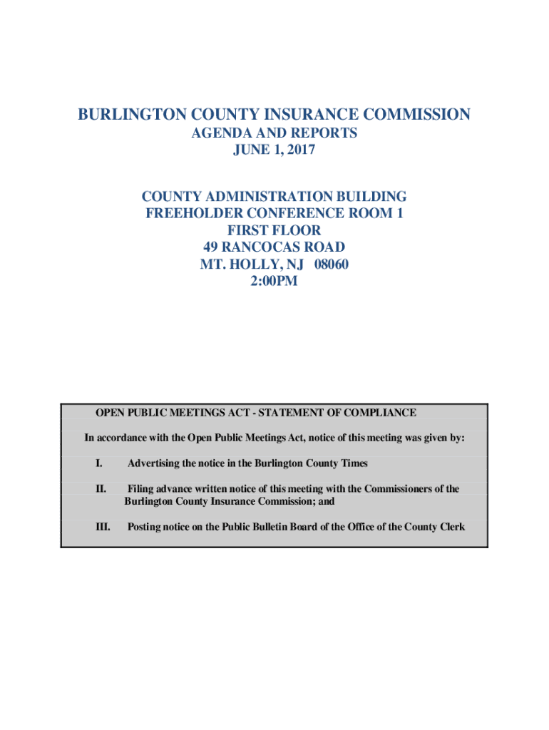 BURLINGTON COUNTY INSURANCE COMMISSION AGENDA AND REPORTS JUNE 1, 2017, COUNTY ADMINISTRATION BUILDING FREEHOLDER CONFERENCE ROOM 1 FIRST FLOOR 49 HANCOCK ROAD MT. HOLLY, NJ 08060 2:00PMOPEN PUBLIC