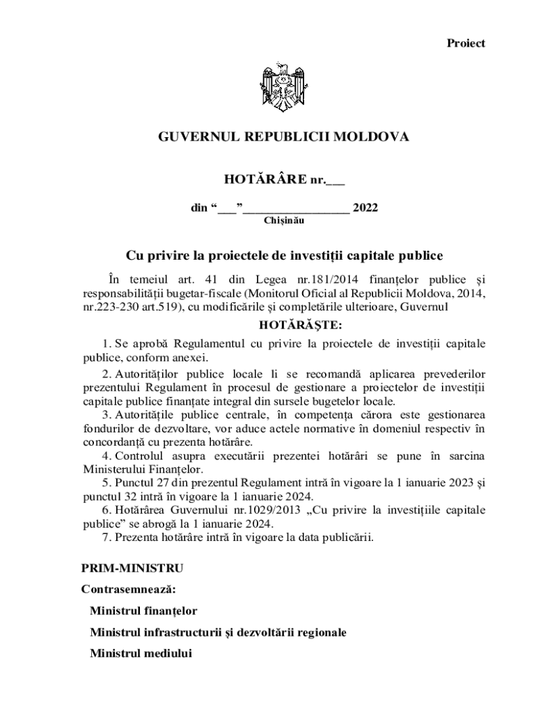 ProiectGUVERNUL REPUBLICAN MOLDOVA HORSE NR.___ din ______ 2022 Chisinau privier la projectile DE invest iii capital public n Temecula art. 41 din Leger nr.181/2014 financier public i responsibility