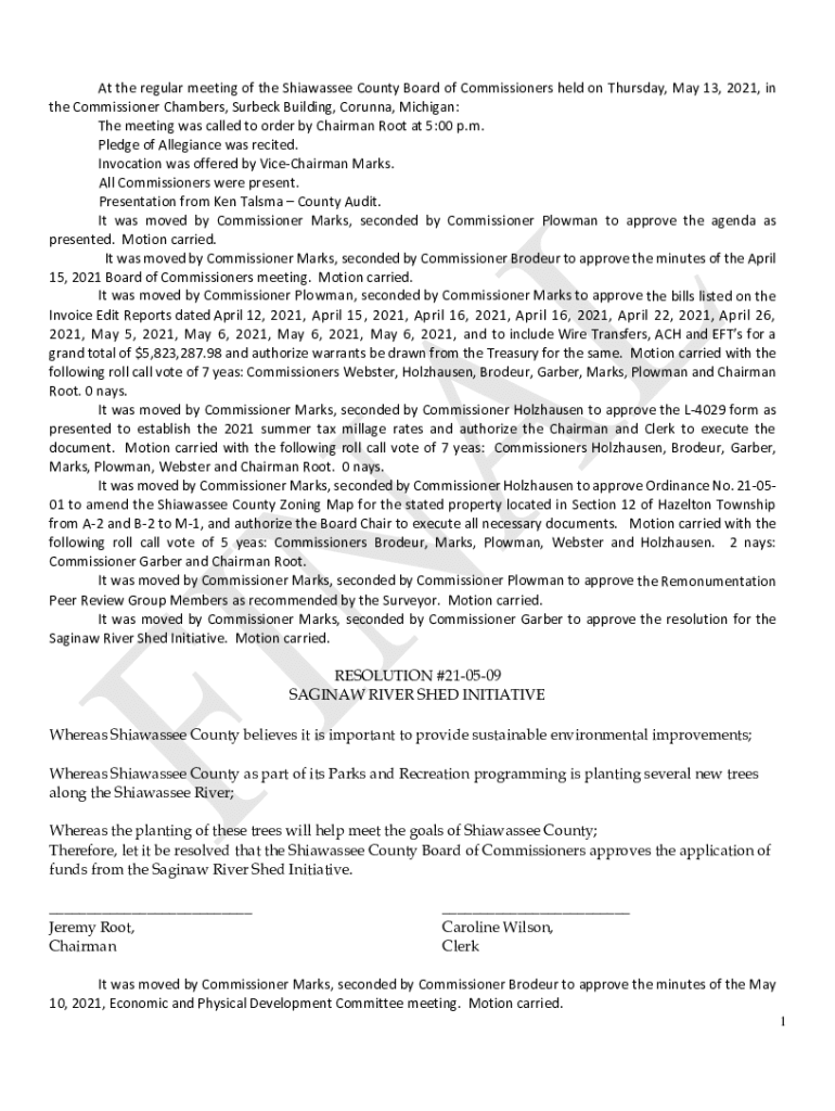 At the regular meeting of the Shiawassee County Board of Commissioners held on Thursday, May 13, 2021, in