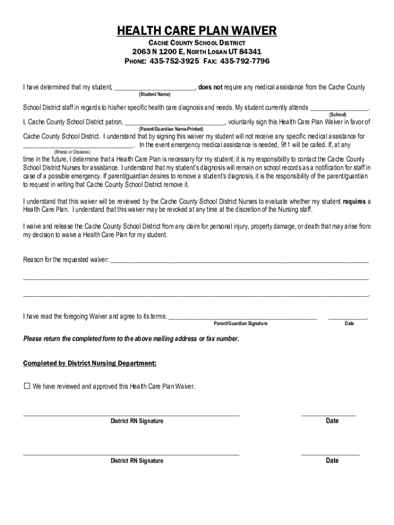 HEALTH CARE PLAN WAIVER CACHE COUNTY SCHOOL DISTRICT 2063 N 1200 E, NORTH LOGAN UT 84341 PHONE: 4357523925 FAX: 4357927796 I have determined that my student, ___, does not require any medical assistance