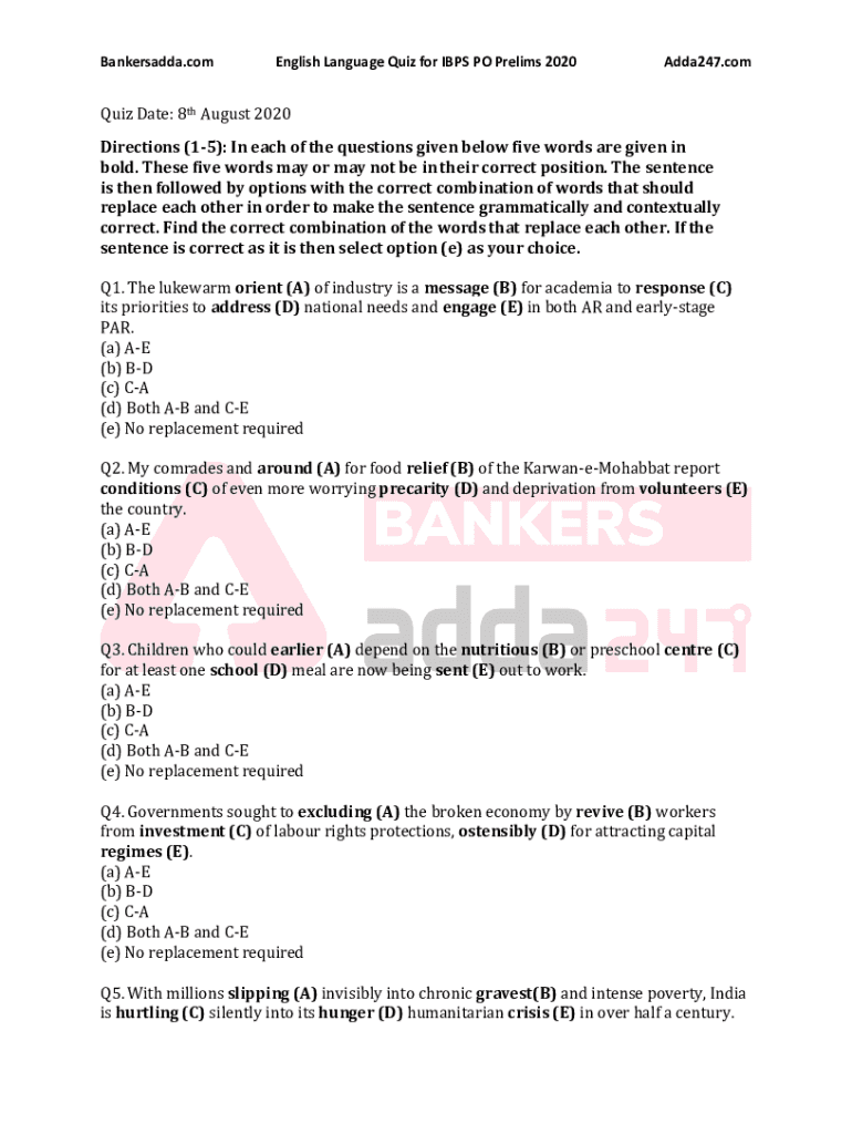 Bankersadda.com English Language Quiz for IPS PO Prelims 2020Adda247.comic Date: 8th August 2020 Directions (15): In each of the questions given below five words are given in bold. These five words