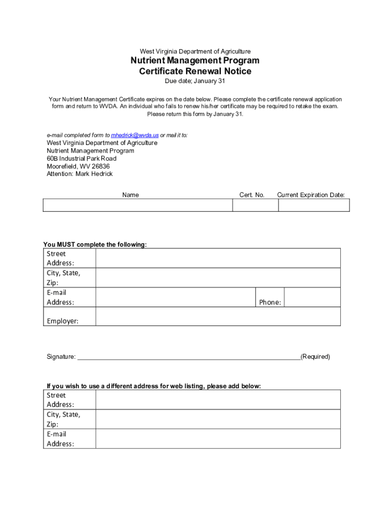 West Virginia Department of AgricultureNutrient Management Program Certificate Renewal Notice Due date; January 31Your Nutrient Management Certificate expires on the date below. Please complete the