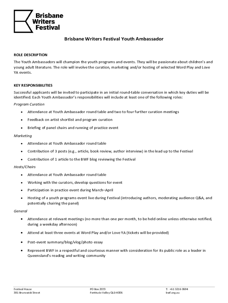 Brisbane Writers Festival Youth Ambassador ROLE DESCRIPTION The Youth Ambassadors will champion the youth programs and events. They will be passionate about children's and young adult literature.