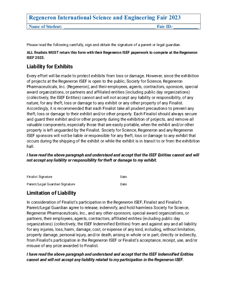 Regeneron International Science and Engineering Fair 2023 Name of Student: ___ Fair ID: ___Please read the following carefully, sign and obtain the signature of a parent or legal guardian. ALL finalists