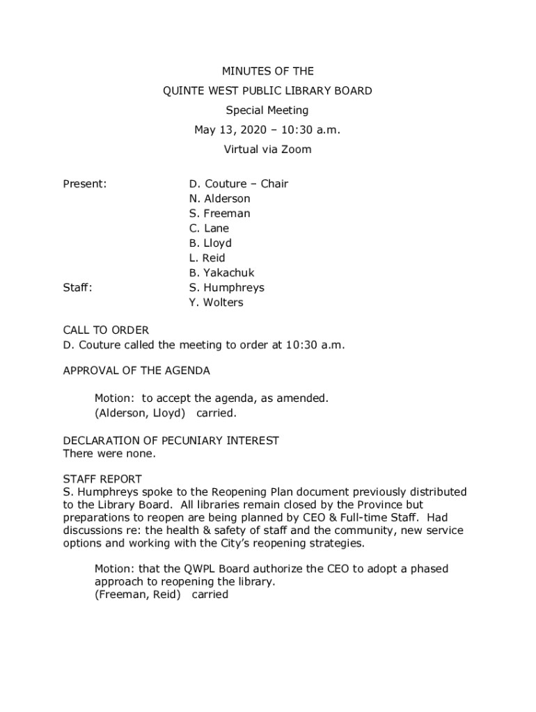 MINUTES OF THE QUITE WEST PUBLIC LIBRARY BOARD Special Meeting May 13, 2020 10:30 a.m. Virtual via Zoom Present:Staff'd. Couture Chair N. Anderson S. Freeman C. Lane B. Lloyd L. Reid B. Alachua S.