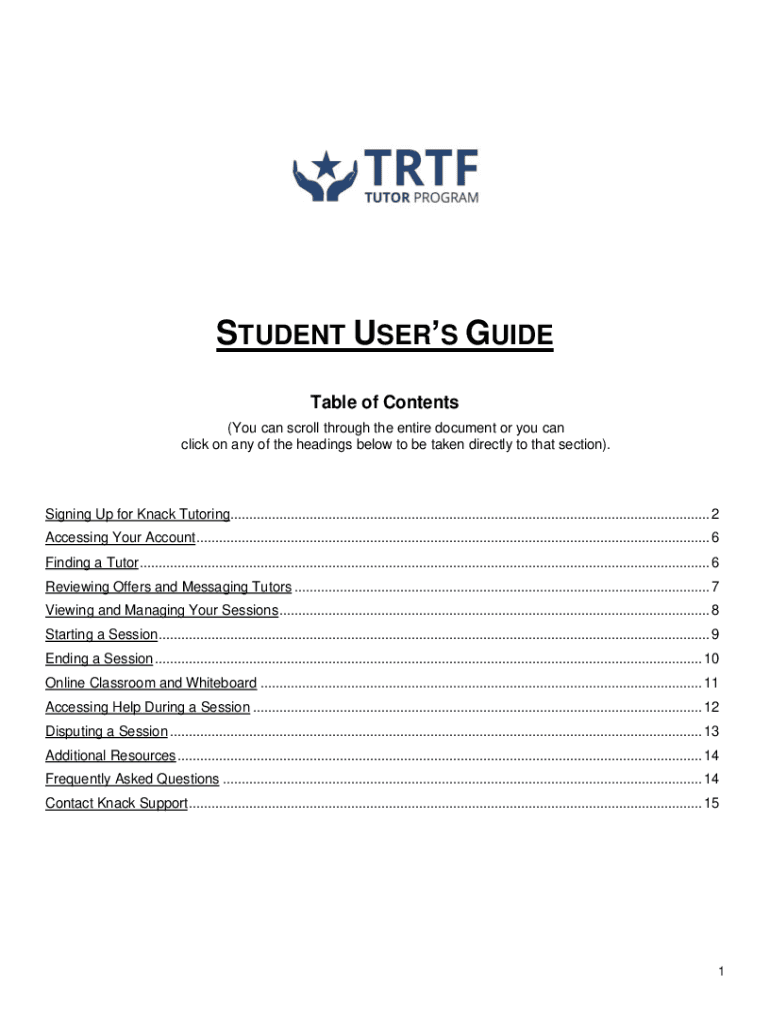 STUDENT USERS GUIDE Table of Contents (You can scroll through the entire document, or you can click on any of the headings below to be taken directly to that section). Signing Up for Knack Tutoring...............................................................................................................................