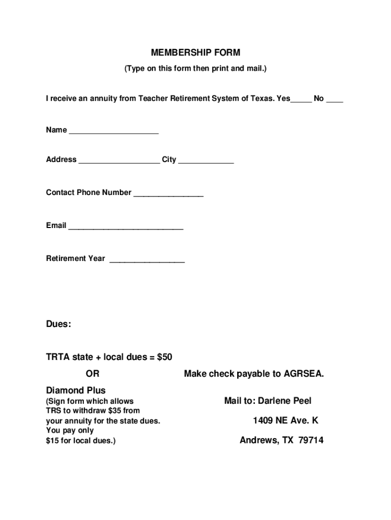 MEMBERSHIP FORM (Type on this form then print and mail.) I receive an annuity from Teacher Retirement System of Texas. Yes___ No ___Name ___Address ___ City ___Contact Phone Number ___Email ___Retirement
