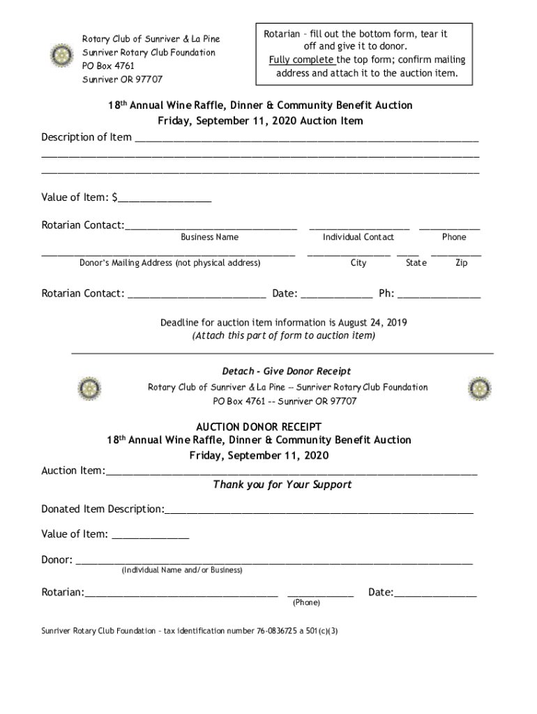 Rotarian fill out the bottom form, tear it off and give it to donor. Fully complete the top form; confirm mailing address and attach it to the auction item. Rotary Club of Sun river & La Pine Sun