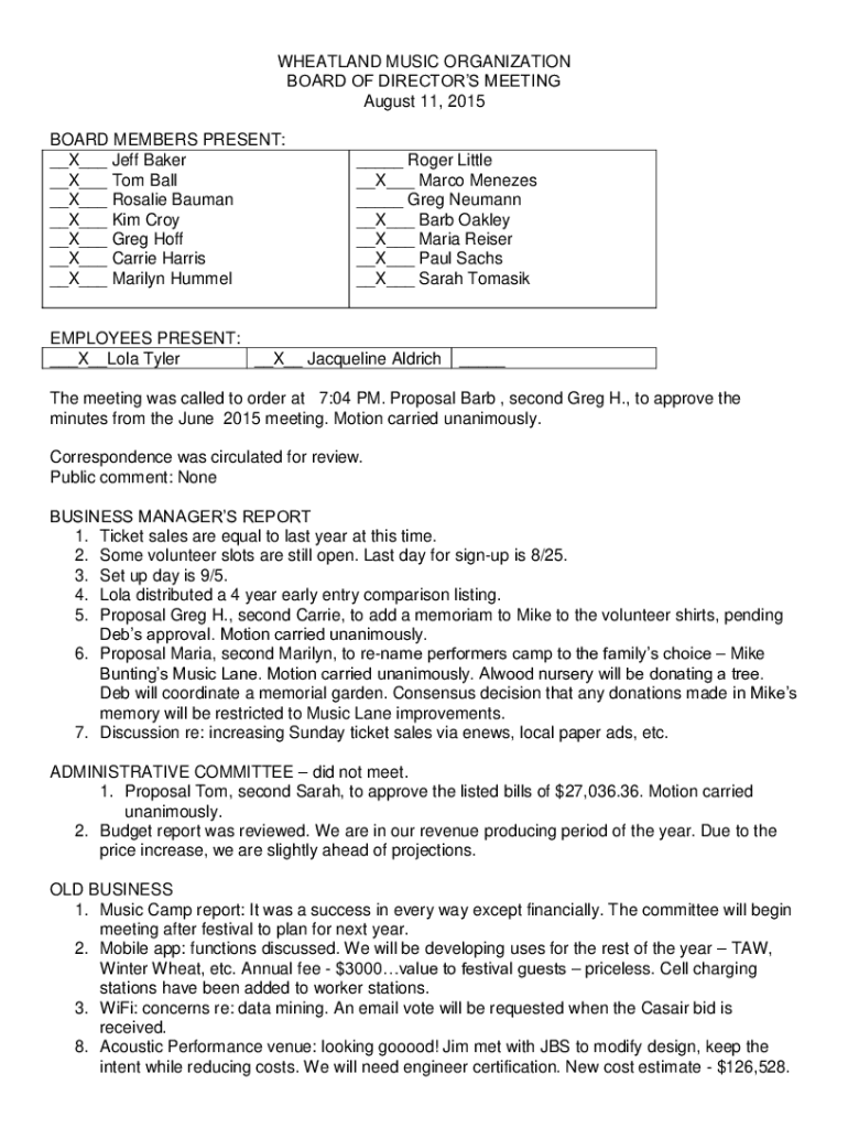 WETLAND MUSIC ORGANIZATION BOARD OF DIRECTORS MEETING August 11, 2015, BOARD MEMBERS PRESENT: __X___ Jeff Baker __X___ Tom Ball __X___ Rosalie Batman __X___ Kim Crop __X___ Greg Hoff __X___ Carrie