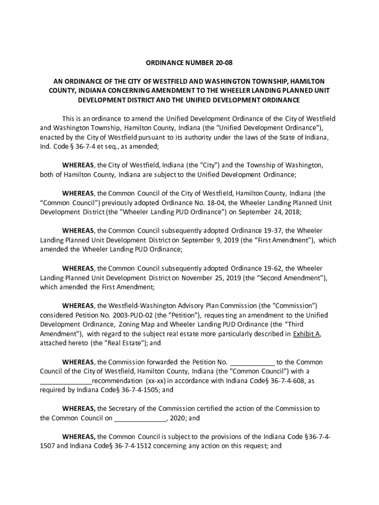 ORDINANCE NUMBER 2008 AN ORDINANCE OF THE CITY OF WESTFIELD AND WASHINGTON TOWNSHIP, HAMILTON COUNTY, INDIANA CONCERNING AMENDMENT TO THE WHEELER LANDING PLANNED UNIT DEVELOPMENT DISTRICT AND THE
