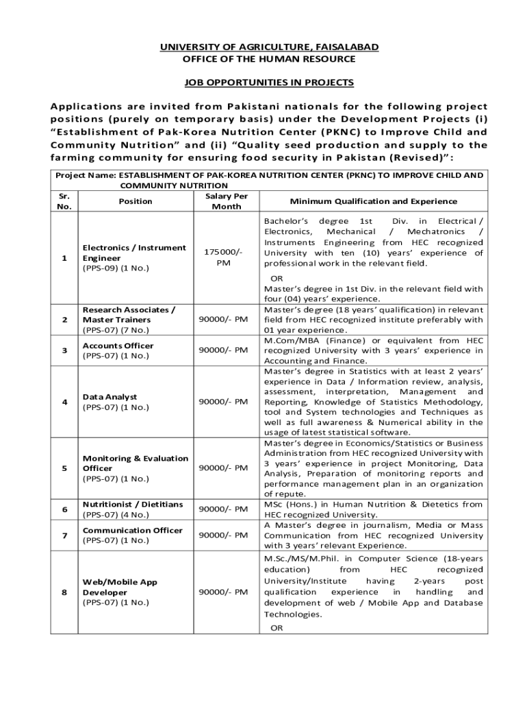 UNIVERSITY OF AGRICULTURE, FAISALABAD OFFICE OF THE HUMAN RESOURCE JOB OPPORTUNITIES IN PROJECTS Applications are invited from Pakistani nationals for the following project positions (purely on temporary