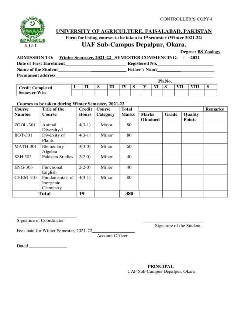 CONTROLLERS COPYIUNIVERSITY OF AGRICULTURE, FAISALABAD, PAKISTAN Form for listing courses to be taken in 1st semester (Winter 202122)UHF Campus Gopalpur, Kara.UG1Degree: BS Zoology ADMISSION TO: Winter