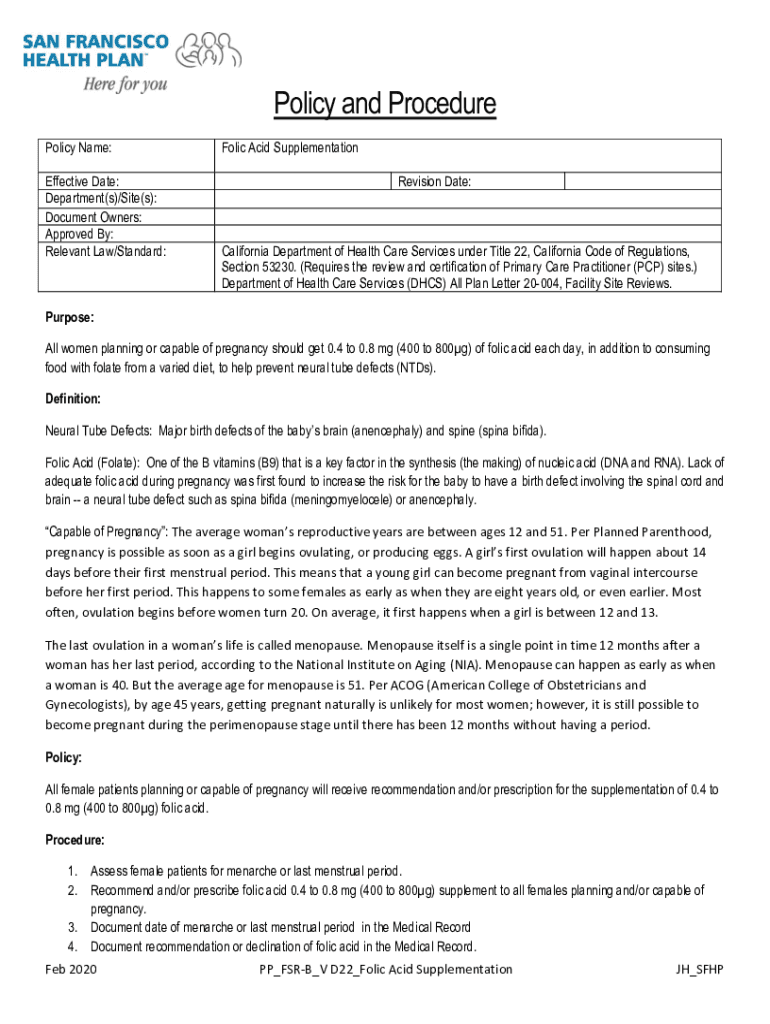 Policy and Procedure Policy Name: Effective Date: Department(s)/Site(s): Document Owners: Approved By: Relevant Law/Standard:Folic Acid Supplementation Revision Date:California Department of Health