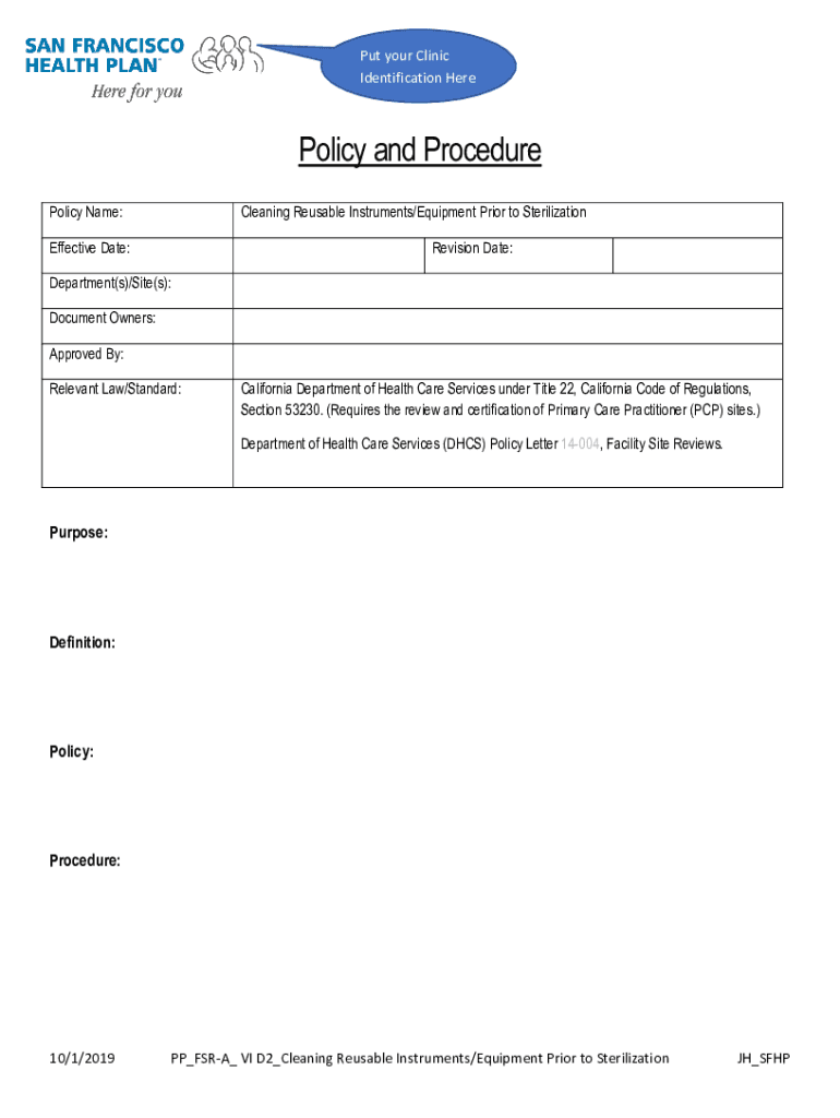 Policy Name:Cleaning Reusable Instruments/Equipment Prior to SterilizationEffective Date:Revision Date:Department(s)/Site(s):