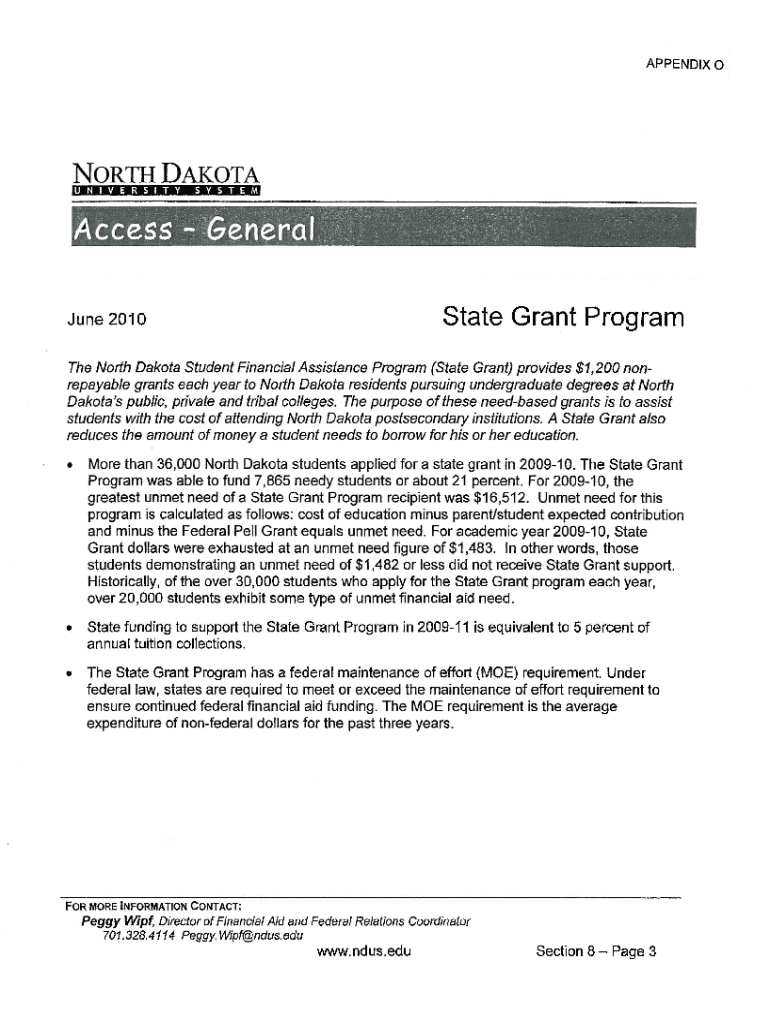 APPENDIX 0NORTH DAKOTA11\'\'\'\'i\'\'\'\'\'\'.\'\'State Grant Program June 2010The North Dakota Student Financial Assistance Program (State Grant) provides $1,200 nonrepayable grants each year to