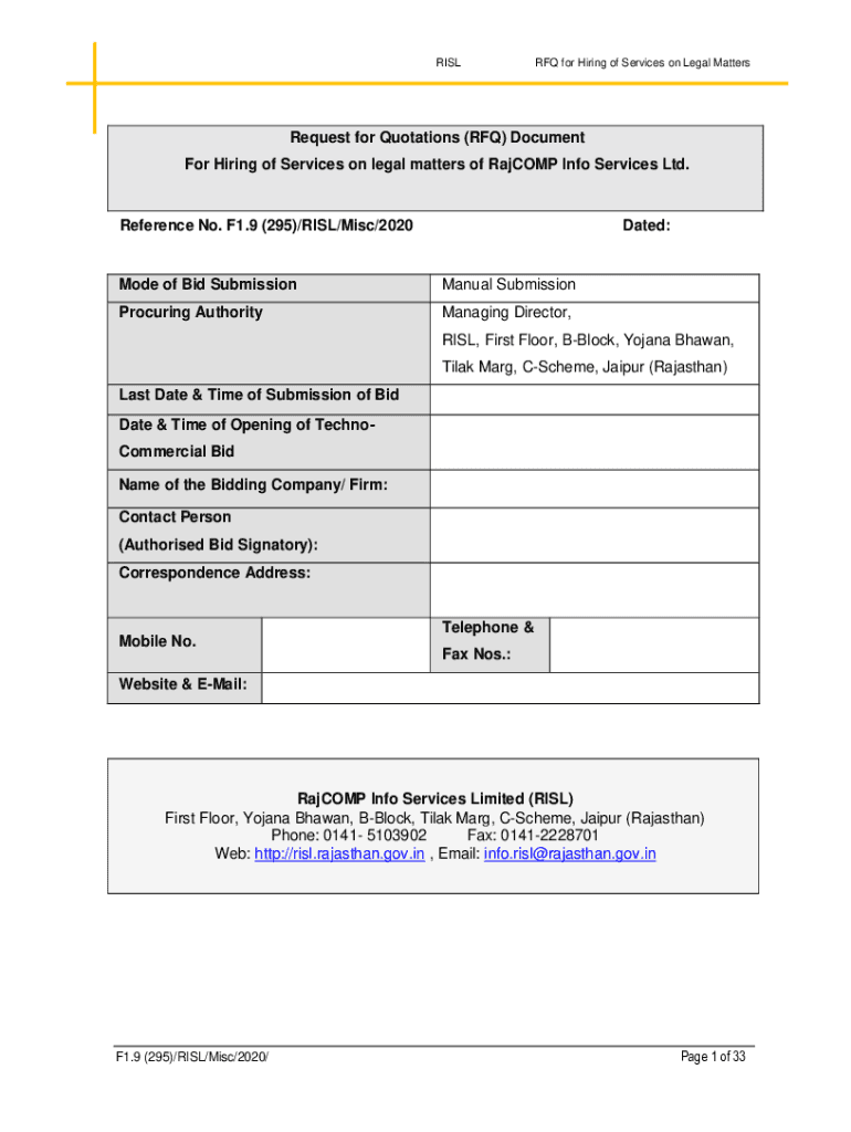 RISER for Hiring of Services on Legal MattersRequest for Quotations (RFQ) Document For Hiring of Services on legal matters of Random Info Services Ltd. Reference No. F1.9 (295)/RISE/Misc/2020Dated:Mode