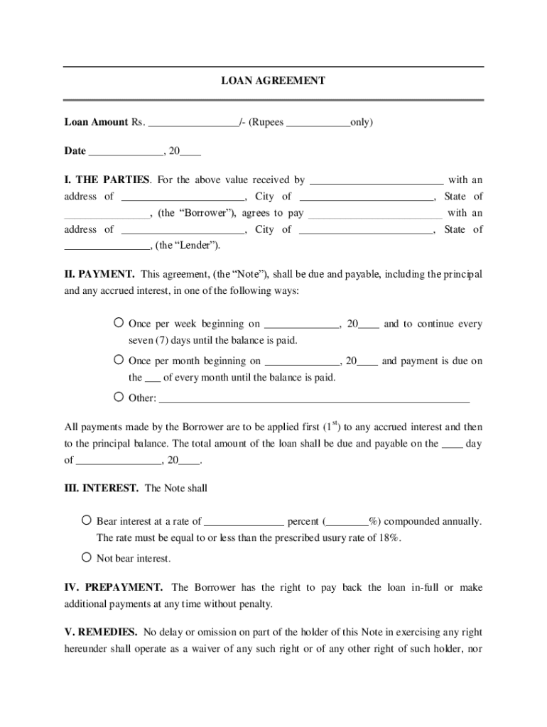LOAN AGREEMENTLoan Amount Rs. ___/ (Rupees ___only) Date ___, 20___ I. THE PARTIES. For the above value received by ___ with an address of ___, City of ___, State of ___, (the Borrower), agrees to