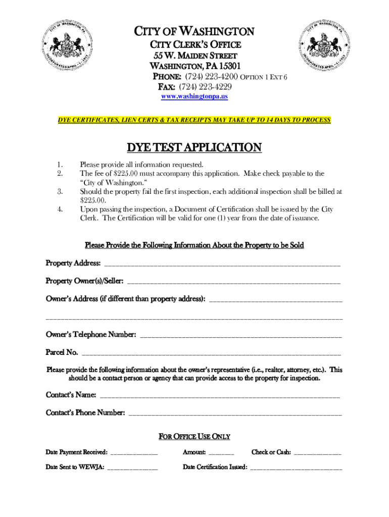 CITY OF WASHINGTON CITY CLERKS OFFICE 55 W. MAIDEN STREET WASHINGTON, PA 15301 PHONE: (724) 2234200 OPTION 1 EXT 6 FAX: (724) 2234229 www.washingtonpa.us DYE CERTIFICATES, LIEN CERTS & TAX RECEIPTS