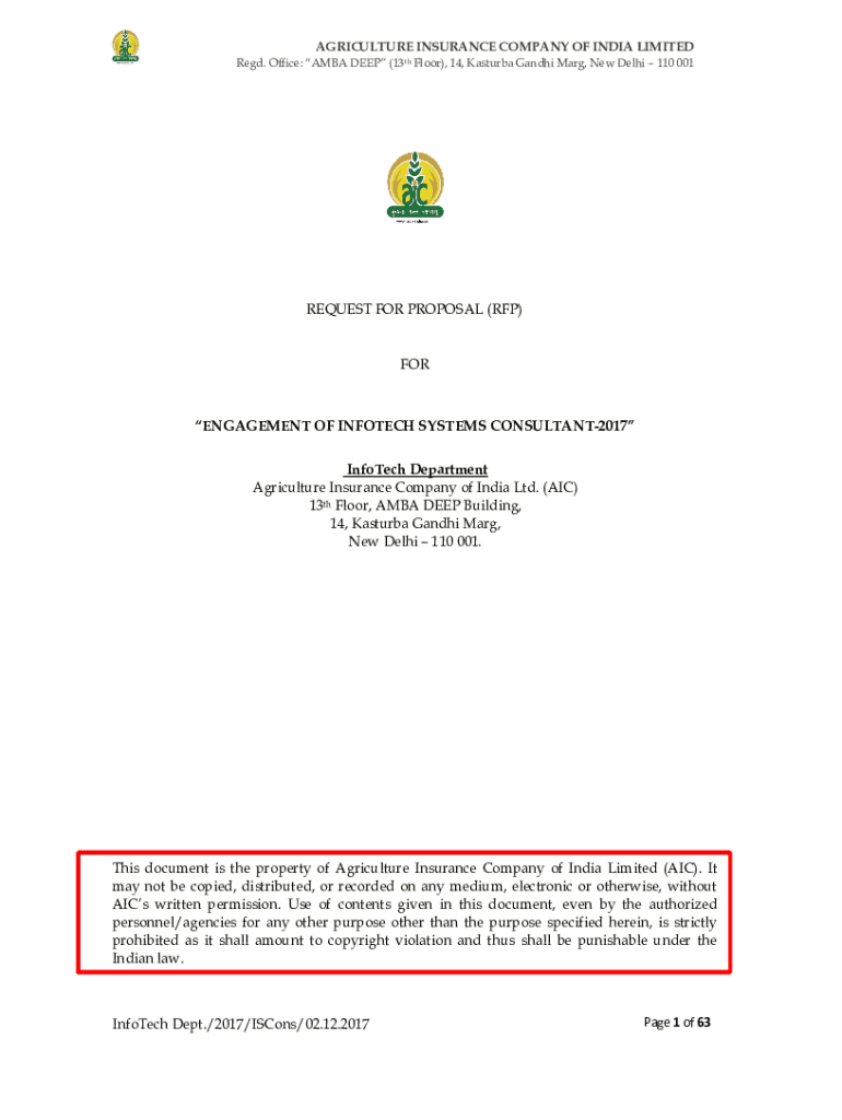 AGRICULTURE INSURANCE COMPANY OF INDIA LIMITED Red. Office: SAMBA DEEP (13th Floor), 14, Pasture Gandhi Mary, New Delhi 110 001REQUEST FOR PROPOSAL (RFP) ENGAGEMENT OF INFOSEC SYSTEMS CONSULTANT2017