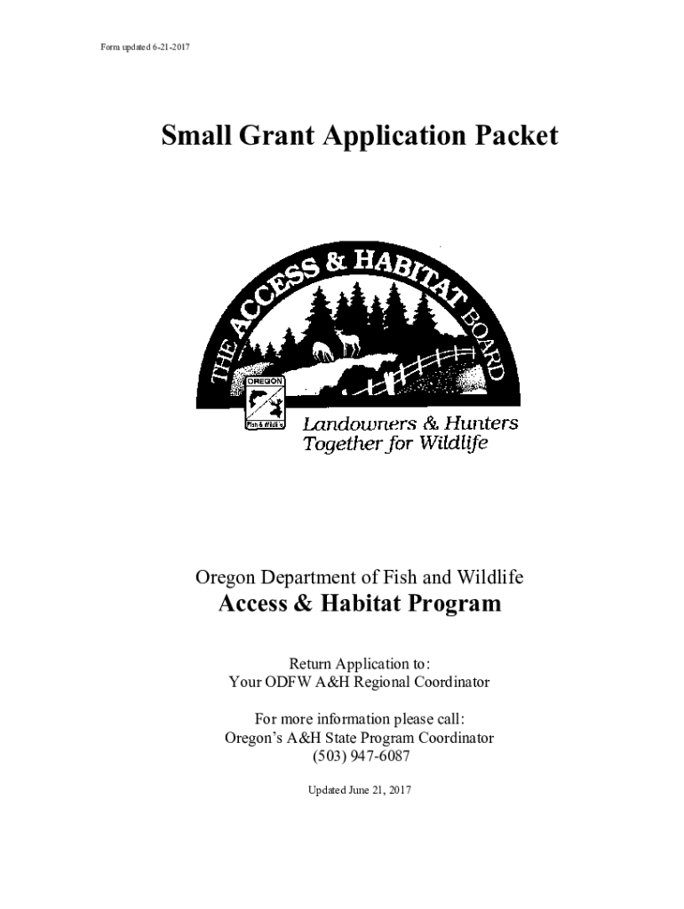 Form updated 6212017Small Grant Application Packet Oregon Department of Fish and WildlifeAccess & Habitat Program Return Application to: Your DFW A&H Regional Coordinator For more information please