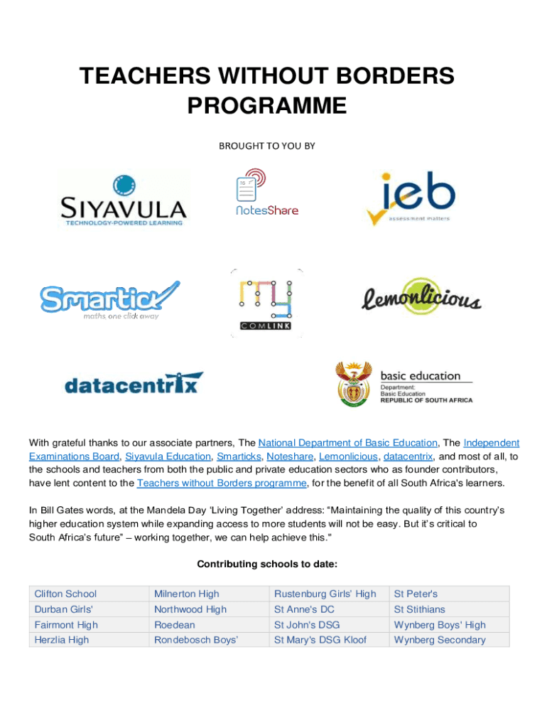 TEACHERS WITHOUT BORDERS Program BROUGHT TO YOU With grateful thanks to our associate partners, The National Department of Basic Education, The Independent Examinations Board, Scapula Education, Smarties,