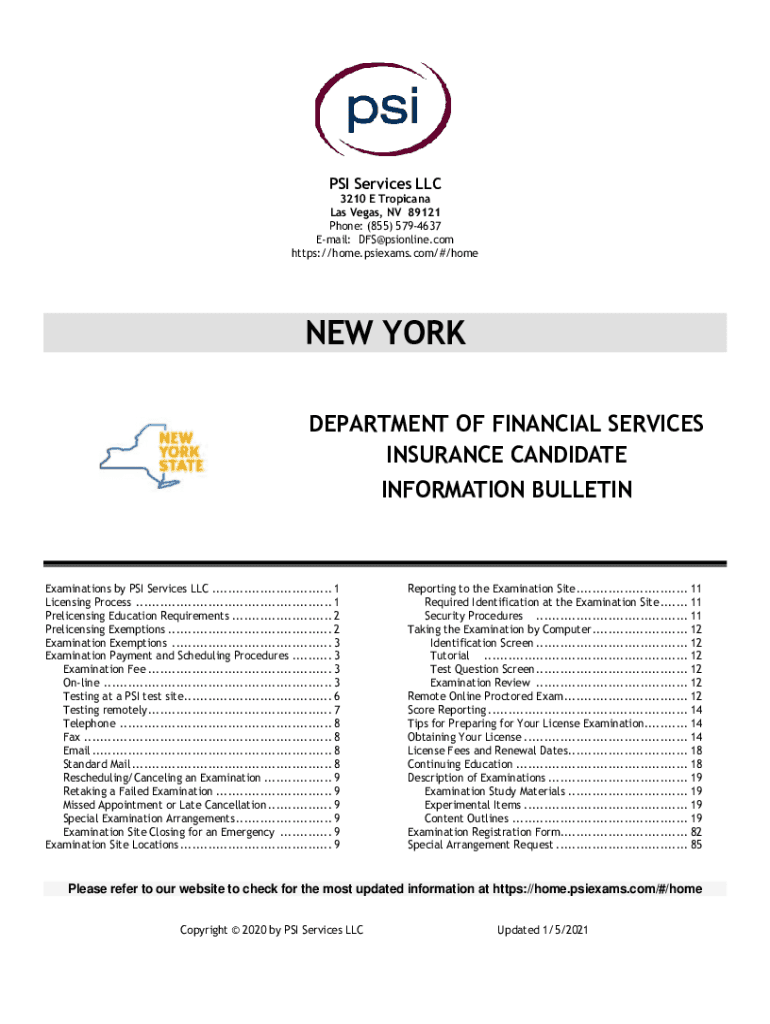 PSI Services LLC 3210 E Tropicana Las Vegas, NV 89121 Phone: (855) 5794637 Email: DFS@psionline.com https://home.psiexams.com/#/homeNEW YORK DEPARTMENT OF FINANCIAL SERVICES INSURANCE CANDIDATE INFORMATION