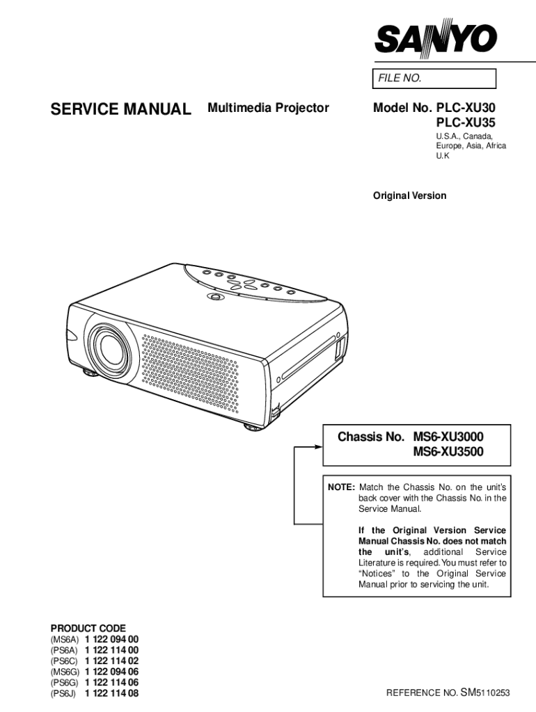 FILE NO.SERVICE MANUALMultimedia ProjectorModel No. PLCXU30 PLCXU35 U.S.A., Canada, Europe, Asia, Africa U. Original VersionChassis No. MS6XU3000 MS6XU3500 NOTE: Match the Chassis No. on the units