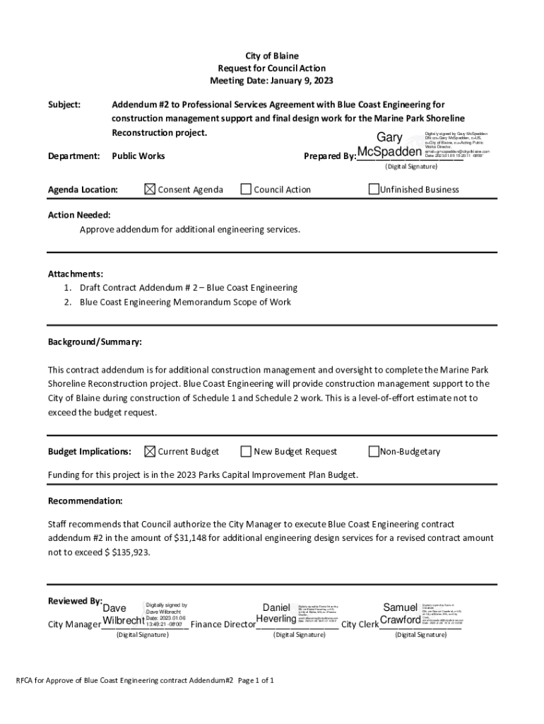 City of Blaine Request for Council Action Meeting Date: January 9, 2023, Subject:Department:Addendum #2 to Professional Services Agreement with Blue Coast Engineering for construction management support