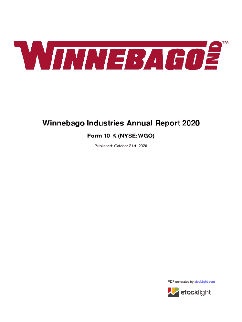 Winnebago Industries Annual Report 2020 Form 10K (NYSE:WHO) Published: October 21st, 2020PDF generated by stock light. Counted STATES SECURITIES AND EXCHANGE COMMISSION Washington, D.C. 20549FORM