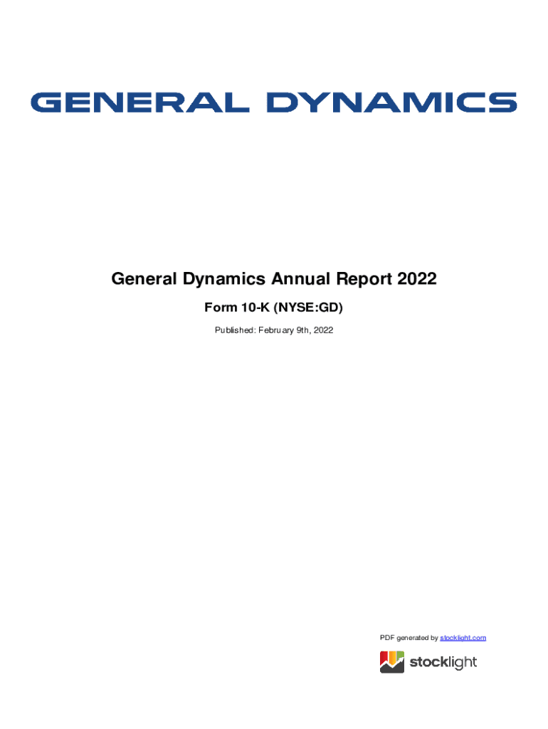 General Dynamics Annual Report 2022 Form 10K (NYSE:GD) Published: February 9th, 2022PDF generated by stock light.comgd20211231_g1.disunited STATES SECURITIES AND EXCHANGE COMMISSION Washington, D.C.
