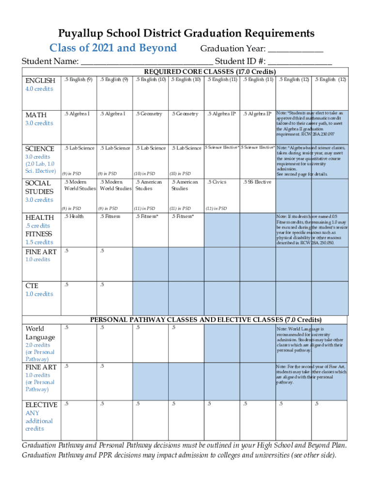Puyallup School District Graduation Requirements Class of 2021 and Beyond Graduation Year: ___Student Name: ___ Student ID #: ___ REQUIRED CORE CLASSES (17.0 Credits)ENGLISH.5 English (9).5 English