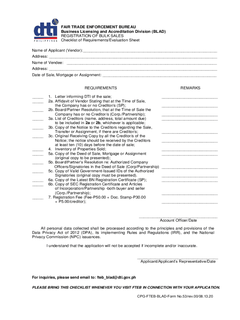 FAIR TRADE ENFORCEMENT BUREAU Business Licensing and Accreditation Division (BAD) REGISTRATION OF BULK SALES Checklist of Requirements/Evaluation Sheet Name of Applicant (Vendor):___ Address: ___